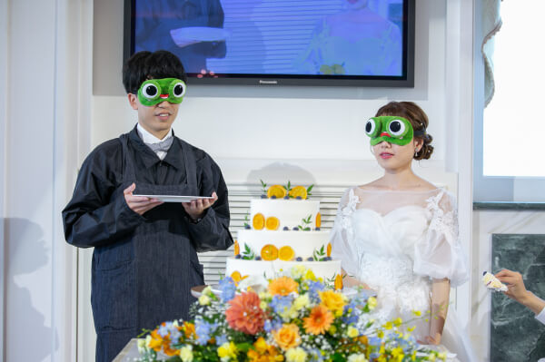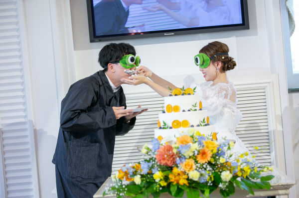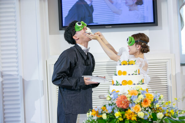 新郎様にはお互い目隠しをしてのファーストバイトで