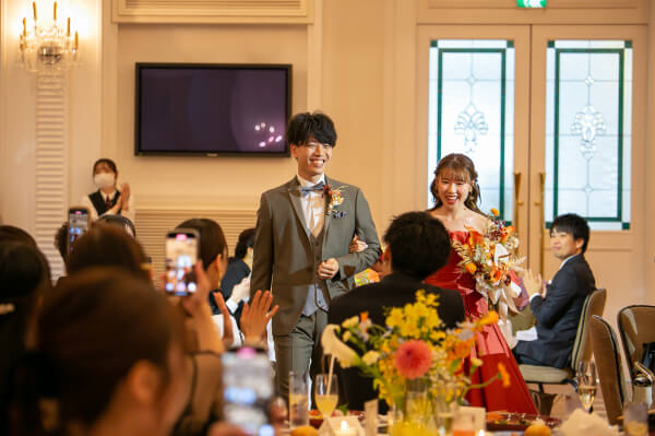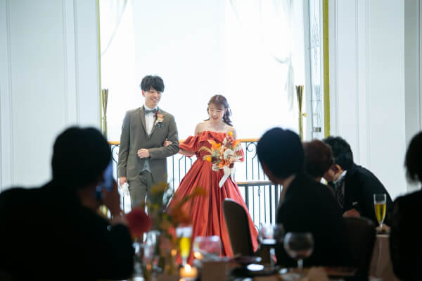 お色直しはオレンジのドレスにカーキのタキシード